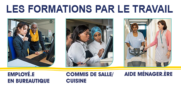 - 3 formations par le travail : Aide ménager et aide ménagère sociaux, Commis de salle et de cuisine et Employé-e en bureautique